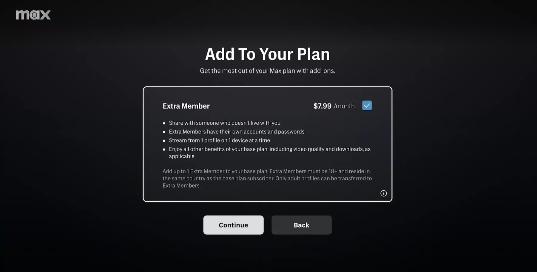 Max anunció nuevas funciones en Estados Unidos que incluyen Extra Member Add-On, una opción para que los suscriptores añadan un miembro adicional a su cuenta, y la capacidad de transferir perfiles de adultos a estas cuentas adicionales. Esto permite a los usuarios continuar accediendo a su contenido, como series originales de Max, HBO y películas de Warner Bros. Según JB Perrette, CEO de Warner Bros Discovery, estas actualizaciones buscan ofrecer más opciones para gestionar el uso compartido de cuentas.