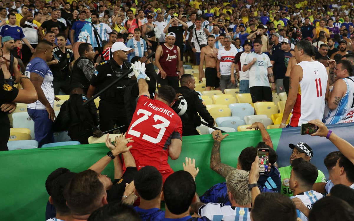 Los campeones del mundo visitantes, liderados por el capitán Lionel Messi, se acercaron a las gradas para intentar calmar los ánimos antes de abandonar el terreno de juego durante más de 10 minutos.
